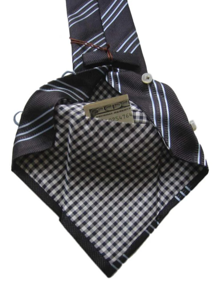 This innovative tie design features mother-of-pearl buttons in the back that opens up to reveal a hidden pocket - large enough to stash a credit card, cash, or what have you.