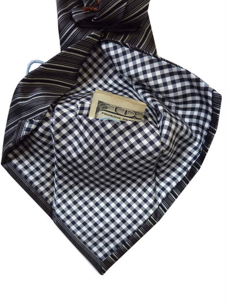 Here's an absolutely incredible tie from Battisti Napoli. This hand made tie is made of a hefty luxurious silk - the quality is unmistakable and the craftsmanship is fantastic! These innovative ties feature mother-of-pearl buttons in the back that open up to reveal a hidden pocket - large enough to stash a credit card, cash, or anything little and light!