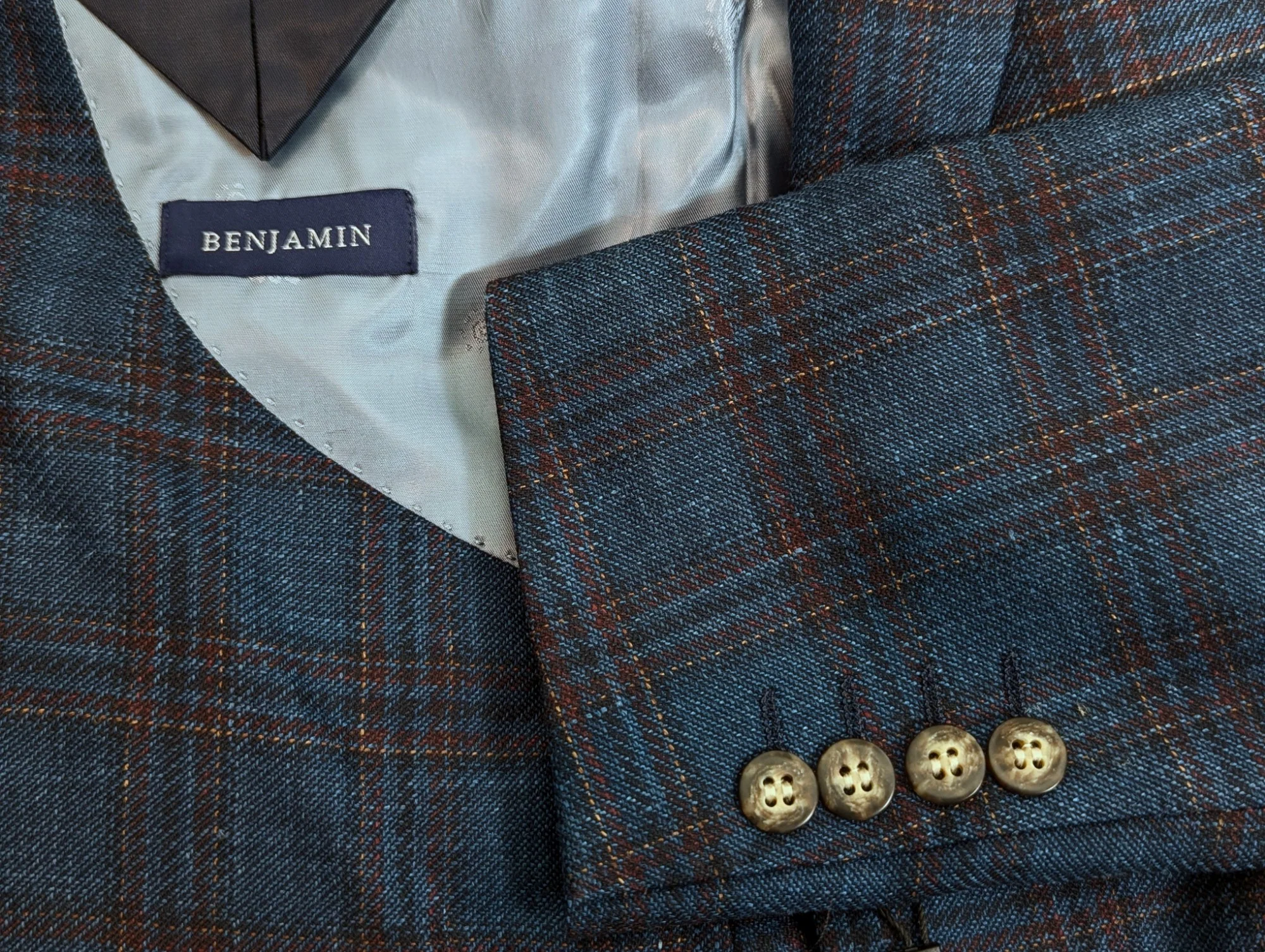 Here is a fantastic jacket from Benjamin made with wonderful spring wool/silk/linen from Cerruti and is incredibly soft, and rich in tone and texture. Wear this with pink, light blue, mauve, lilac, navy, or white shirts and wool trousers in various shades of greys, browns and blues. This jacket also goes well with tan chinos or even tailored jeans.