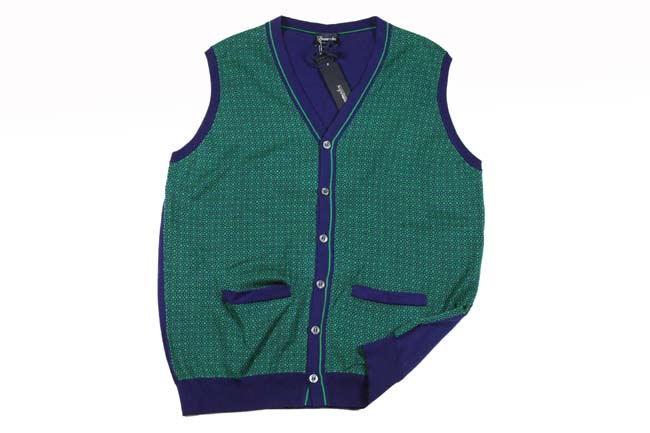 Drumohr Sweater: Small, Kelly green and royal blue pattern, cardigan vest, pure cotton