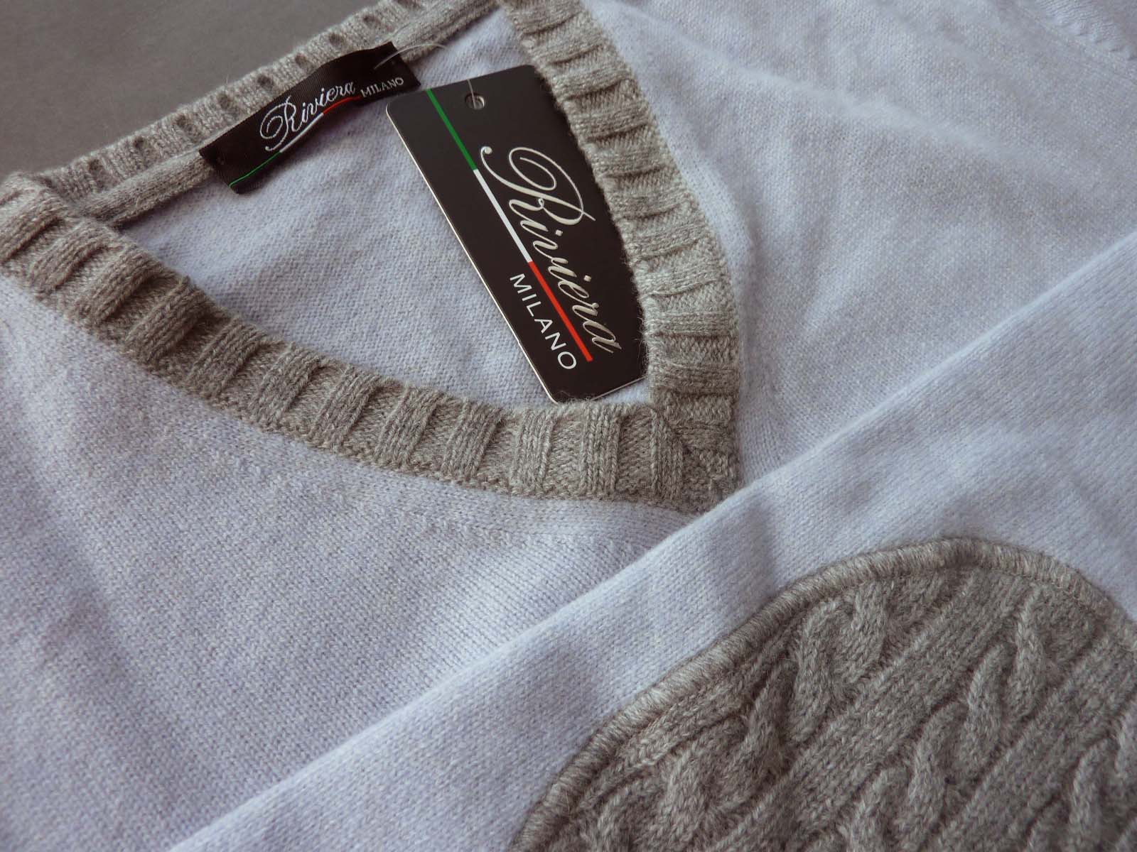 Baby blue with grey, V-neck, wool/cashmere/silk