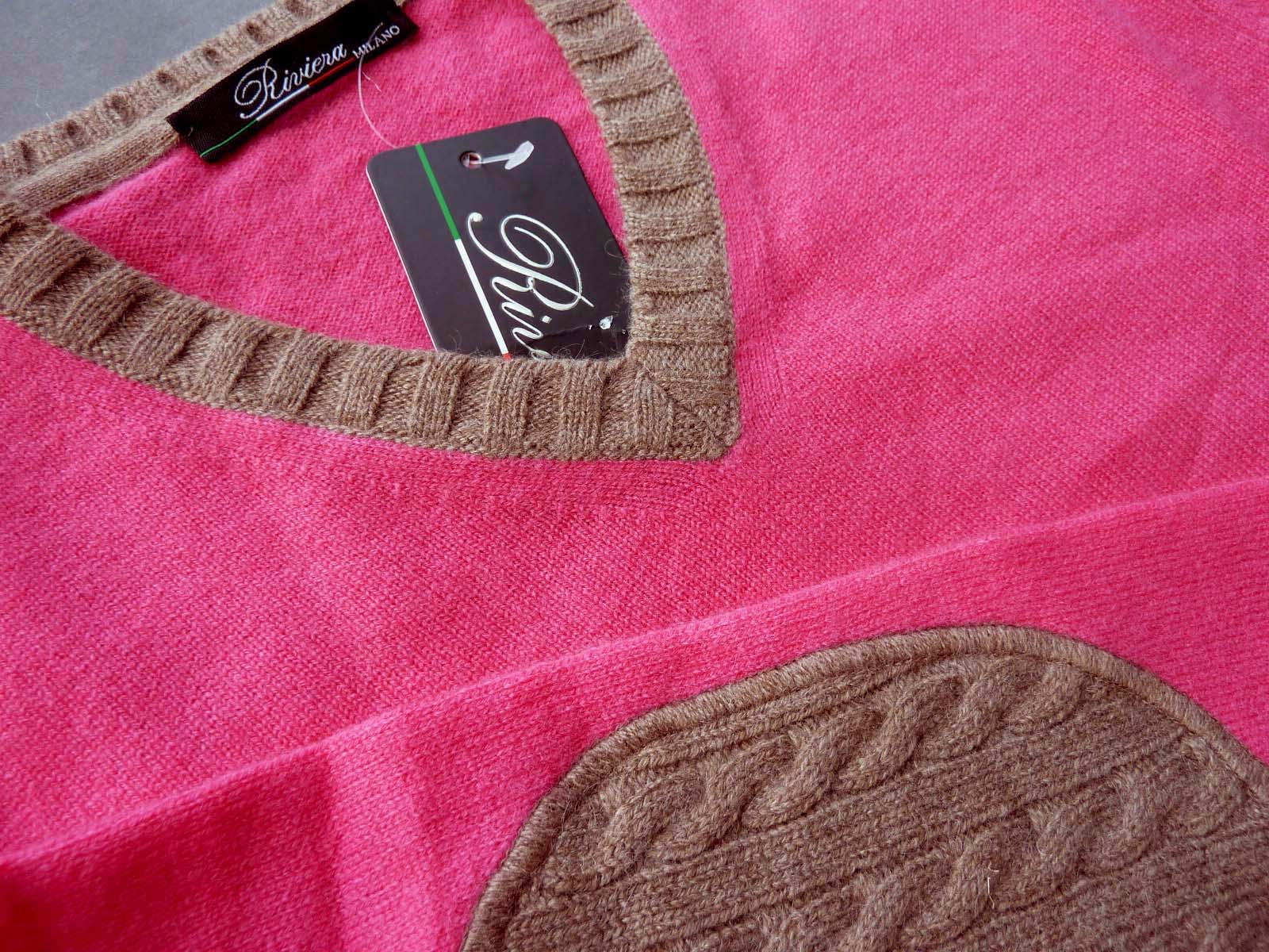 Riviera Sweater: Fucsia with heather brown, V-neck, wool/cashmere/silk